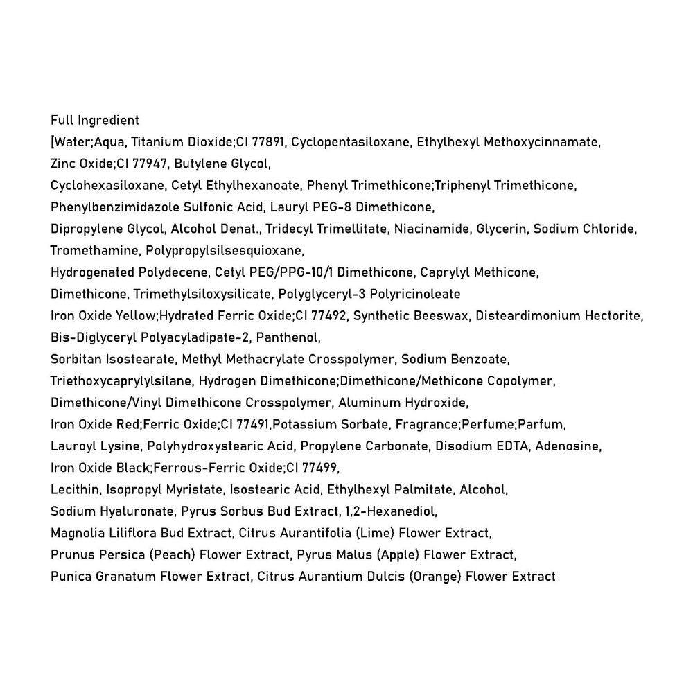 di-t-butyl Hydroxyhydrocinnamate, Hydroxypropyltrimonium Hyaluronate,Ethylhexylglycerin, Calcium Chloride, Fragrance, Iron Oxide Yellow (CI 77492), Iron Oxide Red (CI 77491), Iron Oxide Black (CI 77499)